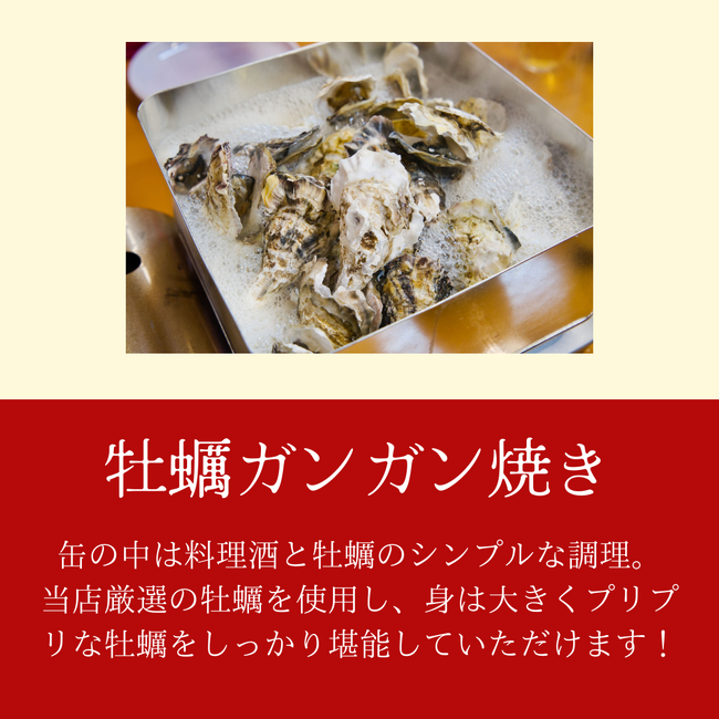 「牡蠣のガンガン焼き」は牡蠣から見直し、ふっくらプリプリな牡蠣を味わっていただけます。それだけではなく、「釜飯」をセットでお付けし、さらに釜飯は3種類から選んでいただけます。「カキ飯」「タコ飯」「タイ飯」