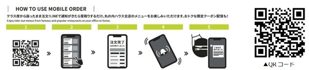 「丸の内ハウスモバイルオーダーエリア」のお好きな席についたまま対象の店舗でテイクアウトメニューを注文できるテーブルオーダーシステム。二次元コードからLINEで友だちを追加後、メニューを選択して注文することができます。商品完成後LINEのメッセージで通知が届くため、丸の内ハウス内のどこにいてもすぐにお呼び出しでき、各店の「TO GOカウンター」で、できたての商品を受け取ることができます。(店舗によりオーダー可能時間が異なります。)