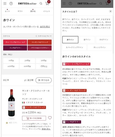 (左)赤ワインの商品一覧ページ。スタイルでの絞り込みが可能。