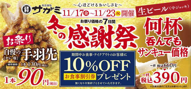 株式会社サガミホールディングスのグループ企業であるサガミレストランツ株式会社(本社:愛知県名古屋市守山区八剣二丁目118番地 代表取締役社長 鷲津 年春)は、2023年11月17日(金)から2023年11月23日(祝)まで、「冬の感謝祭」を開催いたします。サガミの感謝祭は、春・夏・冬の年に3回のみのレア企画。また期間中、ご来店のお客様に、お得な「10%OFF割引券」をプレゼントいたします。