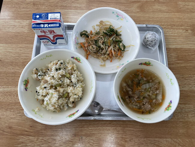 献立 :中華風わかめごはん(白ごま、ごま油使用)、バンバンジー(練りごま、ごま油使用)