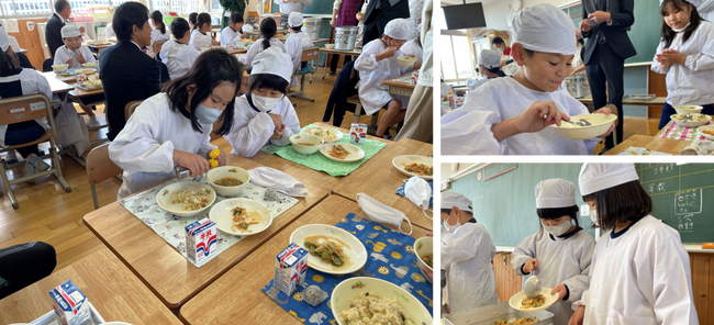 「“ごま”んぞく給食」は、白ごま・ごま油が使用された「中華風わかめごはん」、練りごま・ごま油が使用された「バンバンジー」、純正ごま油やごま油で作られたラー油をかけて楽しむ「春雨スープ」、地元の老舗和菓子店「池本芳栄堂」とコラボした「黒ごま入りだんご」が提供されました。食事を楽しんだ子どもたちからは、「バンバンジーが一番美味しかった!」「また食べたい!」といった言葉があがり、笑顔に包まれていました。子どもたちが楽しむ姿を前に、かどや製油マーケティング推進部の安田さんは、「子どもたちが食育授業の段階から非常にごまに興味をもってくれて、得た知識を給食という形で体感し学びが繋がっていく様子を間近で見て、今回の取り組みは非常に意義のある活動だったと感じています。」と話しました。