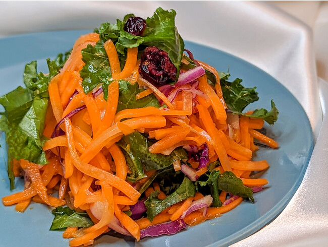 甘さが増した人参と、カーリーケールの独特な苦みが、柚子とみかんの和柑橘の甘酸っぱい香り豊かなドレッシングや甘酸っぱいクランベリーとマッチし、素材の味を引き立てます。