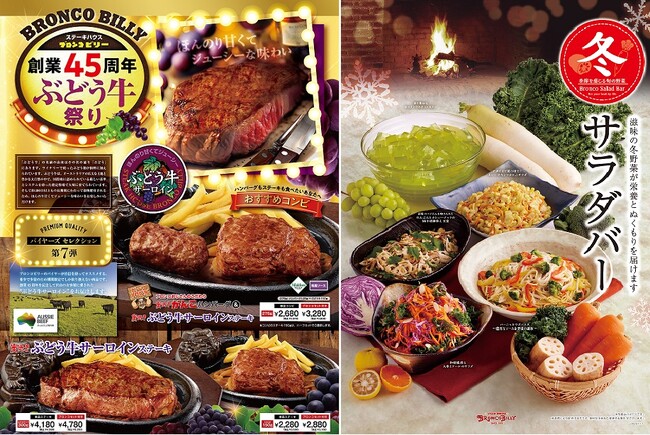 ステーキハウス ブロンコビリーを全136店舗展開する株式会社ブロンコビリー(本社:愛知県名古屋市 代表取締役社長:竹市 克弘)は、当社バイヤーが厳選したオーストラリア産のブランド牛「炭焼き ぶどう牛サーロインステーキ」を提供する『創業45周年ぶどう牛祭り』を、11月17日(金)より開催いたします。さらに、冬に旬を迎える根菜類や、濃厚でクリーミーなバーニャカウダパスタサラダなどが楽しめる『冬サラダバー』も、同日より提供を開始します。URL: http://www.bronco.co.jp/
