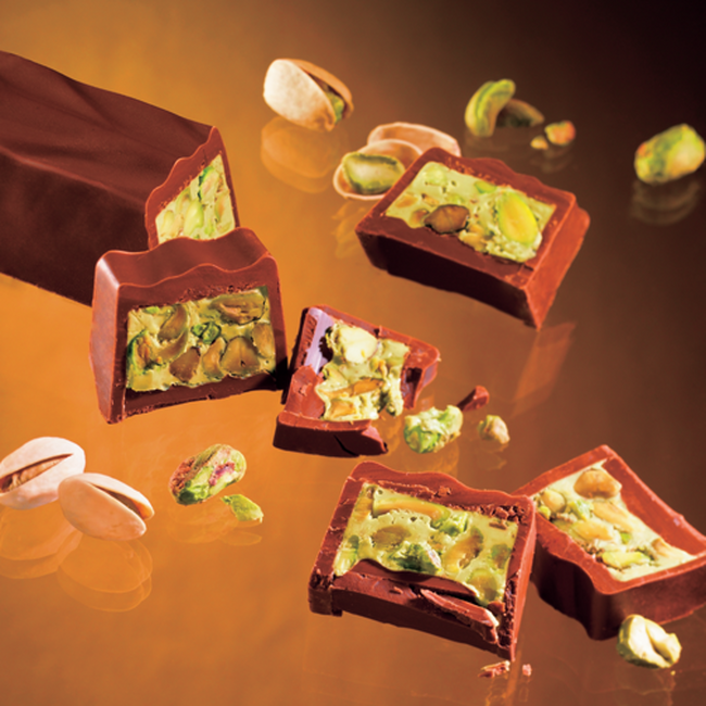 粗く砕いたカリフォルニア産のピスタチオ、クッキークランチ、アーモンドパフを合わせて、ピスタチオペーストを練り込んだミルクチョコレートでひとつに。ザクッとした食感とともに、ピスタチオの香ばしさと旨みが広がります。
