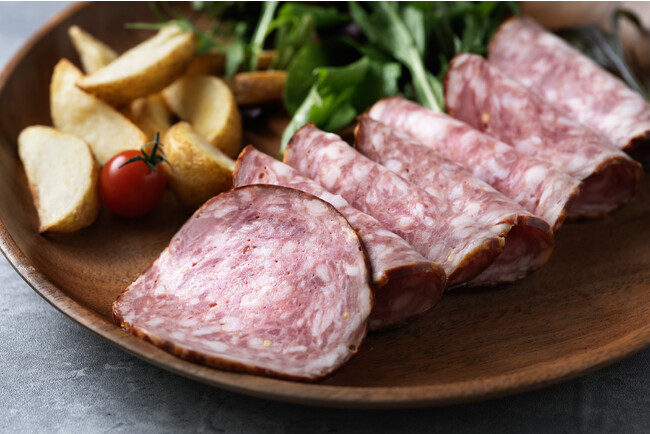 ドライ仕上げのサラミ風ソーセージ。燻製を強めにかけ、10日間低温熟成でしあげています。ほのかに薫るマスタードもお楽しみください。旨みが凝縮した濃厚な味わいはビールはもちろんワインのお供にもオススメです。