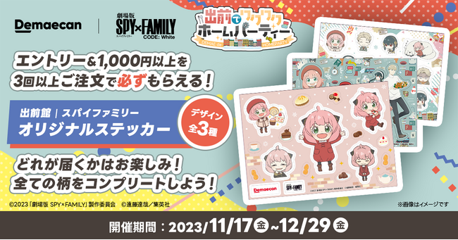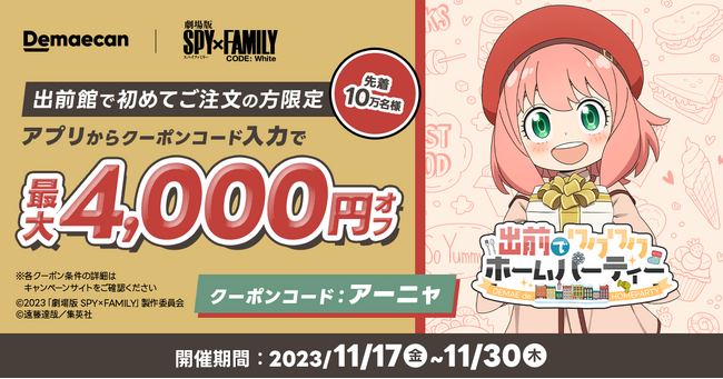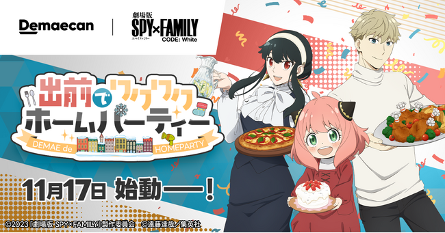 株式会社出前館(本社:東京都渋谷区、代表取締役社長:藤井英雄)が運営する日本最大級のデリバリーサービス『出前館』は、「劇場版 SPY×FAMILY CODE: White」とのタイアップキャンペーンを開催いたします。「出前でワクワクホームパーティー」をテーマにした今回のキャンペーンは、第1弾を2023年11月17日(金)から開始し、お得にデリバリーを楽しめるクーポンの配布や『出前館』でしか手に入らないオリジナルグッズのプレゼント企画を実施いたします。