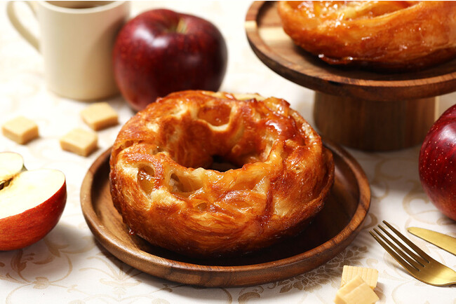 こだわり:デニッシュ生地にごろっと果肉感のあるりんごを巻き込んで焼き上げ、表面をキャラメリゼしてクイニーアマン風に仕上げました。甘酸っぱいりんごとキャラメリゼのパリパリ感や香ばしさがやみつきな冬の”季節のリング”。多くのお客様に味わっていただきたい思いより、従来の季節のリングよりお求めやすい価格でお楽しみいただけます。