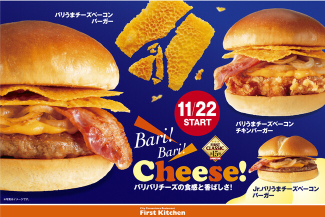 今回の新商品では、このパリパリチーズを大胆に2枚使用することで、「バリバリ」とした食感を楽しむことができます。また、とろ~りチーズやグリルオニオンとの相性も抜群で「うまみ」もたっぷり。「バリバリ食感でとってもうまい!」を※博多弁のバリ(とても)にかけて、「バリうまチーズベーコンバーガー」と命名しました。ファーストキッチンのこだわりが詰まったオリジナル商品をぜひご賞味ください。 ※諸説あり。