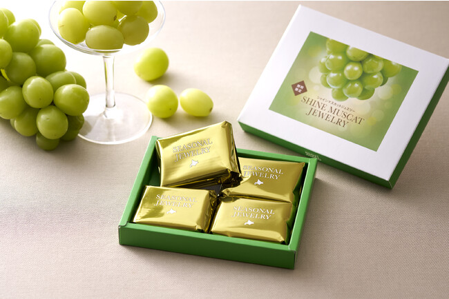 鮮やかな緑が美しい宝石のような果実、仁木町産「シャインマスカット」。糖度が高く大きく美しい実がなるよう、ひと房ずつ丁寧に手入れされ生産者様の愛情が込められてようやく収穫されます。すべての房に手間をかけて大切に生育されますが、一部、どうしても基準に準じない房も出てしまう中で、スイーツにすることで希少な果実を余すことなく全国のお客様にお届けするため、「シャインマスカットジュエリー」を新発売いたします。
