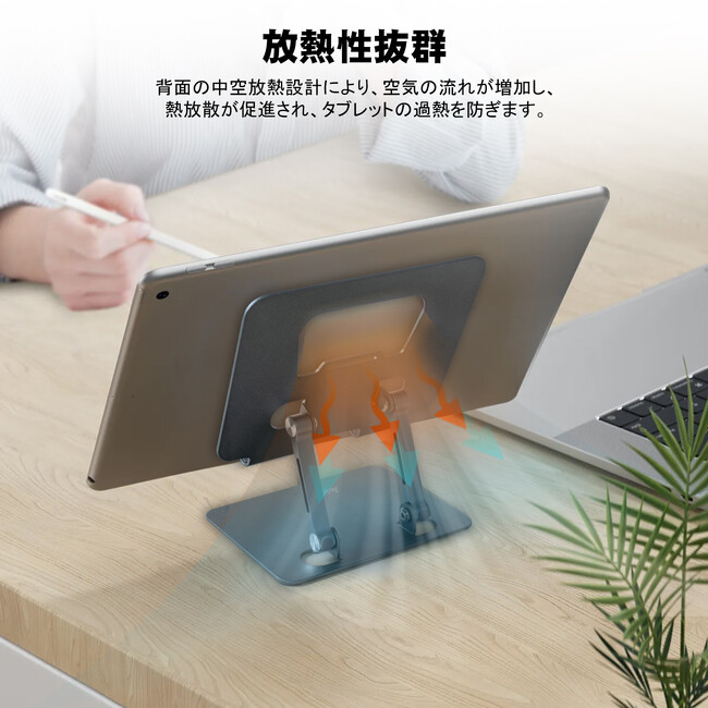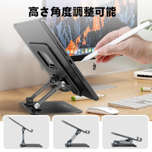 【高さ角度調整可能&人間工学設計】人間工学に基づいて設計により、10°から80°までお好みの角度&高さ自由にに調節できて快適な角度で楽に作業できるようになります。アイパッドスタンドを使ってタブレットに適切な角度と高さを設定することで、視線が高くなり、適切な姿勢を保つことができて肩や腰、首などへの負担が軽減され、猫背などを効果的に防ぐことができます。使いやすさと快適性を両立させています。