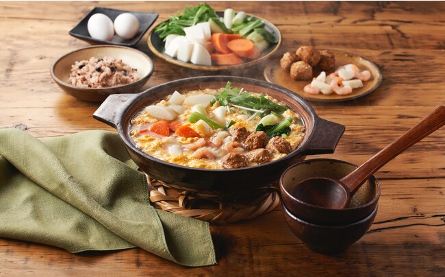 あっさりとした和風とんこつの出汁が香る肉団子鍋。肉団子と海老いかミックスを入れることでで、お肉と魚介の両方を楽しめる贅沢な一品です。卵を投入した後から鍋が出来上がるまでの卵の色や質感の変化をお楽しみいただけます。