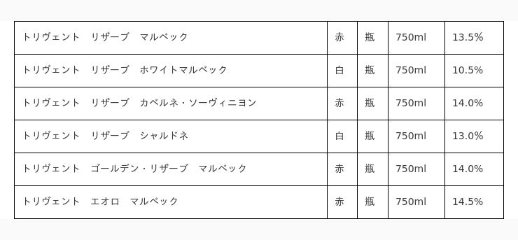 ・「トリヴェント リザーブ シャルドネ」:熟した青リンゴや白桃などの果実の香りが特長で、ミネラル感のある凝縮したフルーティな味わい