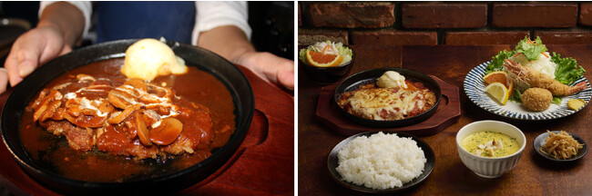 ハンバーグに使うデミグラスソースは、様々な食材を1週間以上煮込み、丁寧に裏漉しした手間暇をかけた一品。そんなデミグラスソースがたっぷりかかったハンバーグを、熱々に熱した鉄板にのせて提供。