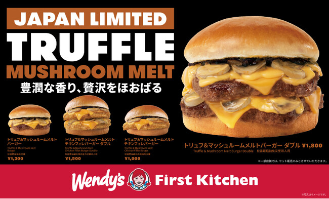 ウェンディーズ冬の定番 “マッシュルームメルト” に、刻んだ黒トリュフのソースと、白トリュフのオイルを振りかけた、高級感あふれる贅沢バーガーです。ビーフ100%のパティは、お肉の旨味もしっかり堪能できます。