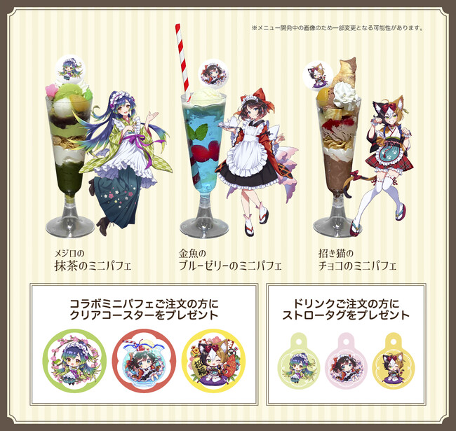 本展オリジナル仕様の作品の展示およびグッズなどの販売。そして森倉円氏描きおろしのキャラクターをイメージしたオリジナルのミニパフェなどのコラボメニューやドリンクの販売を行います。