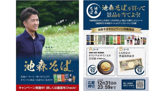 今回はさらにコンテストと同時期に購入者へ向けて、賞金1万円や池森さんサイン入りグッズが当たるキャンペーンを実施します。応募方法は、「池森そば」の商品を2点以上含む、1,000円以上購入したレシートをWebサイトからアップロード。抽選で合計40名様に景品が当たります。