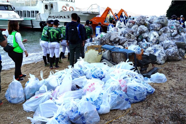 当日は、桟橋などがない場所でも陸揚げできる上陸用舟艇にて、丸亀市の離島「讃岐広島」の普段人が立ち入らない海岸に上陸し清掃活動を実施しました。丸亀市の松永市長をはじめとする市職員、香川県職員、四国アイランドリーグplusの選手に加え、地域住民や学生の皆さま、株式会社丸亀製麺代表取締役社長 山口 寛をはじめとするトリドールグループ社員など約130名による大規模な清掃活動を行いました。結果、合計約1tの離島海岸に散乱するプラスチックなどの漂着ごみを回収しました。