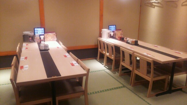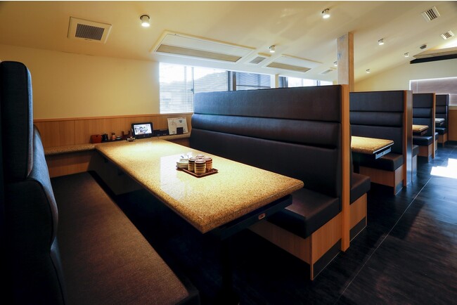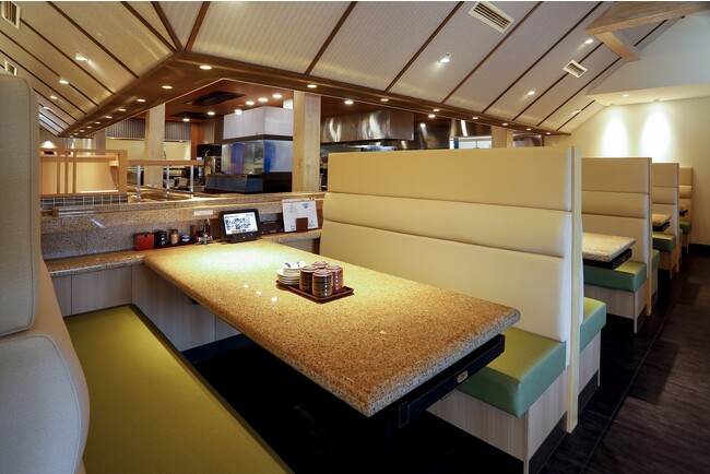 回転レーン横のテーブルはお履き物を脱がずに着座できるベンチシートタイプに変更。(6名掛け×4卓)