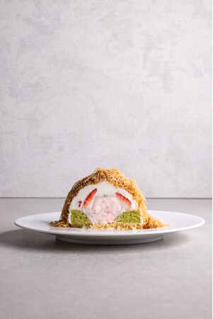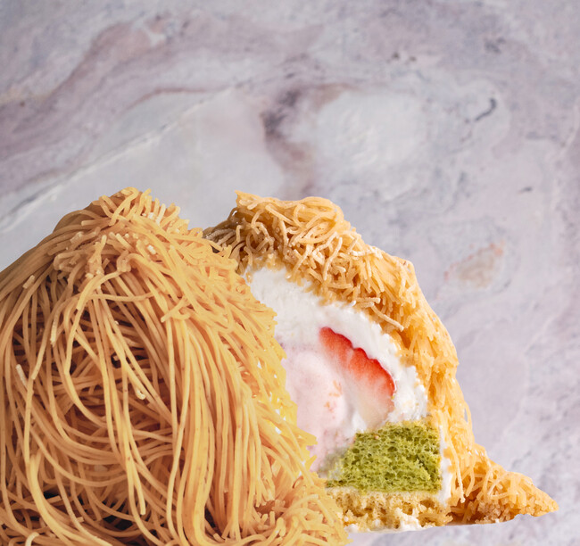 モンブランの中には旬を迎えるいちご、香ばしいピスタチオの生地、サクサクのメレンゲ