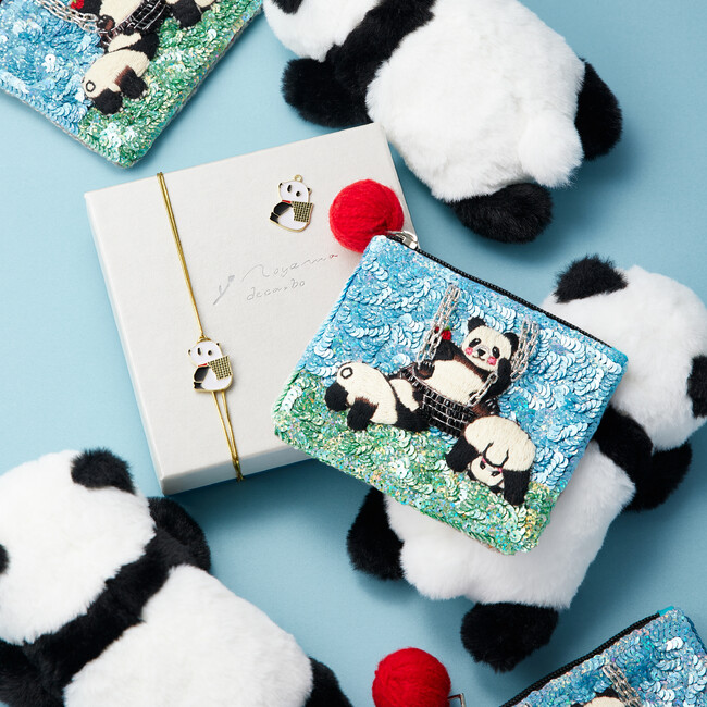 思わずにっこりしてしまう可愛さの『パンダのおしり』を手刺繍で表現し、煌めくスパンコールを敷き詰めた刺繍ポーチ。一つ一つ手刺繍の1点ものなので、手作りならではの個体差もお楽しみいただけます。