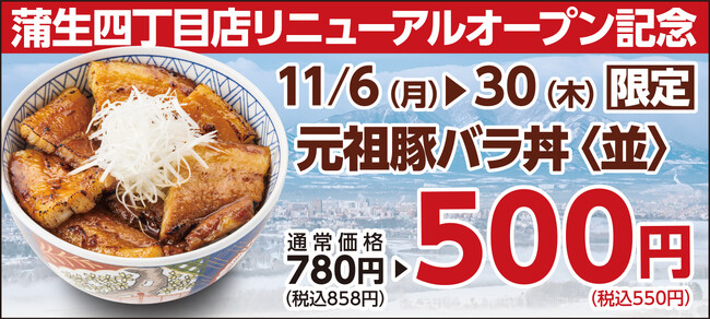 蒲生四丁目店のリニューアルオープンを記念して、11/6(月)~30(木)の期間中、当店自慢の「豚バラ丼〈並〉」を特別価格550円(税込)にて提供いたします。