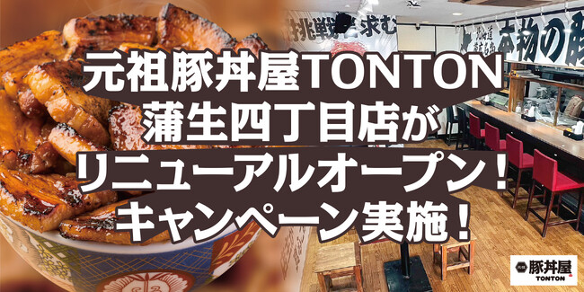 ワンズトライン株式会社(本社:大阪市北区芝田2丁目3番16号、代表取締役:山内仁)が運営する、北海道・帯広伝統の豚丼が人気の「元祖豚丼屋TONTON 蒲生四丁目店」(住所:大阪府大阪市城東区今福西2-5-6、TEL:06-6939-4545)が、'23年11月6日(月)リニューアルオープンいたします。