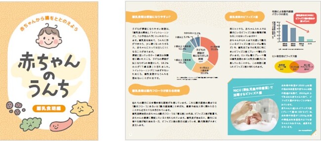 森永乳業と日本トイレ研究所は、“赤ちゃんのうんち(冊子)”を作成しました。この冊子には、子どもの便秘の仕組みや便秘のうんちの写真、対処方法などを紹介しています。冊子を各保育園・幼稚園に配布し、園の先生から園児たちへ、“赤ちゃんのうんち(冊子)”の内容を元に、うんちに関する話について読み聞かせをしてもらいます。保護者にも“赤ちゃんのうんち(冊子)”を配布し、うんちに関する知識を深めてもらいたいと考えています。