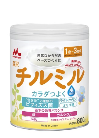 「森永チルミル」では、発達に大事なDHA、食事では不足しがちな鉄・カルシウムなど、1歳から3歳頃までの幼児期に必要な栄養素をバランスよく補給でき、お子さまを守るラクトフェリン、3種類のオリゴ糖などを配合しています。また、フォローアップミルクとして日本初※2のビフィズス菌を配合した育児用ミルクであり、2 種類の“生きた”ビフィズス菌(「M-16V・BB536」を配合しています。いずれも「ヒトにすむタイプのビフィズス菌」で、「ビフィズス菌 M-16V」は乳幼児期に多いビフィズス菌、「ビフィズス菌 BB536」は、乳児から大人まで幅広い世代に多いビフィズス菌です。離乳期から幼児期にかけては腸内細菌叢が大きく変化しますが、この時期の腸内環境に適したビフィズス菌を配合することで、お子さまの元気なからだづくりをさらにサポートします。