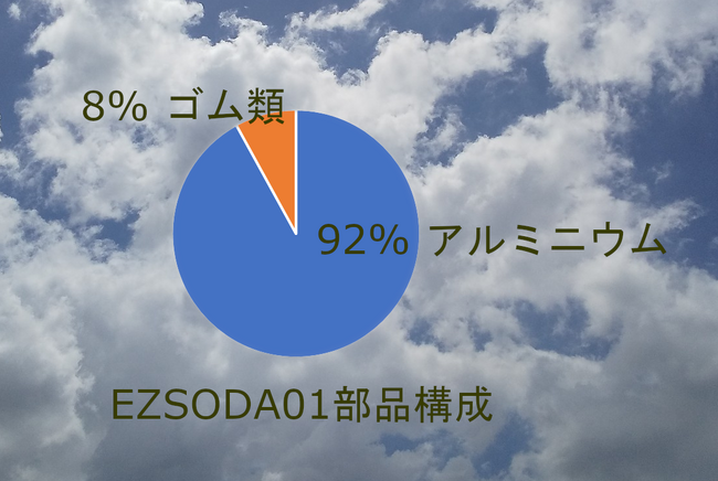 コンパクトにすることで、生産、廃棄時の環境負荷低減となるため「EZSODA01」は最小の部品点数・部品種数となるよう設計を行っています。本体重量の92%以上が長期間使用可能でリサイクル可能なアルミ素材で構成されています。他の8%はゴム類の部品で油化等によりリサイクルできる可能性があります。