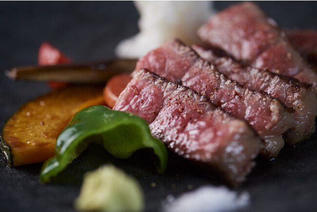 鉄板焼きの花形、ステーキは雌牛にこだわったA5ランクの黒毛和牛。