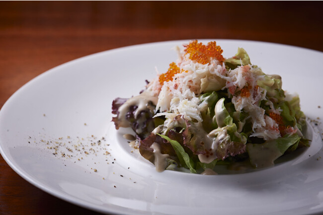 たっぷりの蟹のほぐし身と、カニ味噌を使ったドレッシングで味わうずわい蟹のサラダ