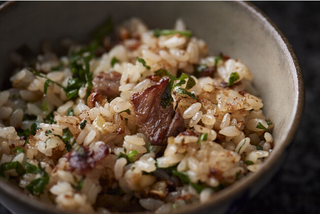 鉄板焼きの定番、ガーリックライスは肉の旨みを絡めつつさわやかな大葉を加えて
