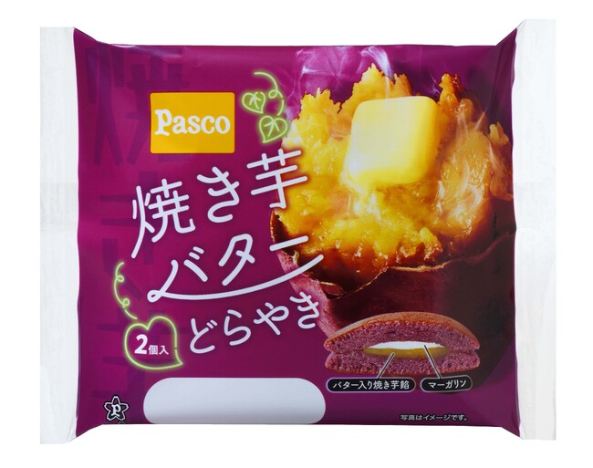 焼き芋をイメージした赤紫色のふんわりとしたどら焼き生地に、バター入り焼き芋餡とマーガリンをはさみました。