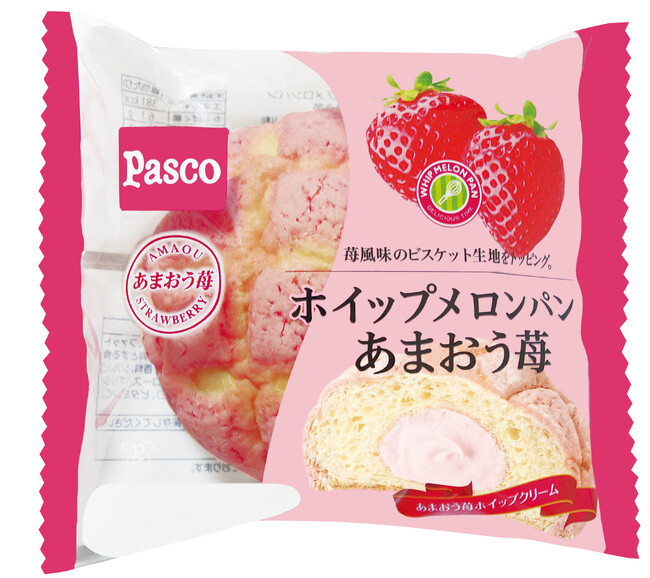 あまおう苺の加糖ピューレを練りこんだ苺風味のビスケット生地をトッピングしたメロンパンに、あまおう苺の濃縮果汁が使用されたホイップクリームをたっぷりと入れました。
