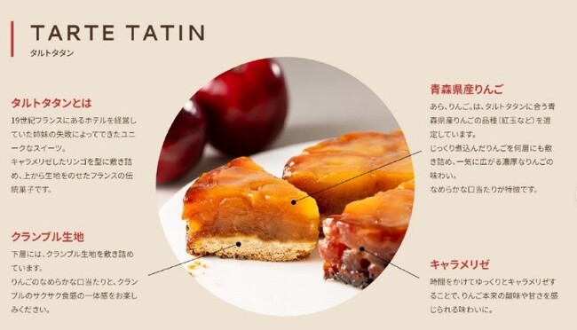 じっくり煮込んだりんごを何層にも重ね、サクサクのクランブル生地とあわせた青森りんごを100%使用したタルトタタンです。