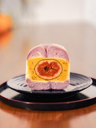 バターときび砂糖で香ばしい色をつけたさつまいもをレアチーズにし、ぐるてんずカヌレ特製の紫芋ベーグルに挟んだ一品です。