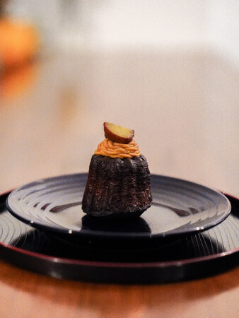 マロンカヌレの中にマロンクリームを注入し、ラムが効いたモンブランクリームと栗の渋皮煮をトッピング。大人なモンブランカヌレです。