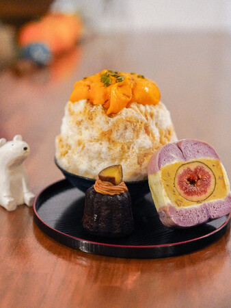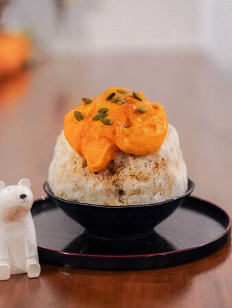 甘みとホクホク感のある九重栗という品種のカボチャを使ったパンプキンカスタードと白熊堂特製ミルク、全体を香りで引き締めるチャイソースを組み合わせました。アクセントのオレンジクリーム、マスカルポーネ、紅茶シフォン、パンプキンシードが織りなす変化とマリアージュをお楽しみください。