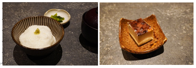 (画像左)【とろろご飯】〆にはとろろご飯もしくはうどんから選択可能。のど越しがよくつるりと食べられる。/(画像中央)【本日のデザート】デザートは薪焼きチーズケーキや季節のジェラートなど、日替わりでご用意。