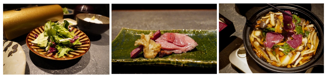 (画像左)【生玉子ドレッシングのサラダ】人気の生玉子ドレッシングをかけたフレッシュなサラダ。箸休めにぴったり。/(画像中央)【みかん猪肩ロースのかまど焼】表面はパリッと中は驚くほどやわらかい。上質な脂の甘みが口の中に広がる。/(画像右)【牡丹鍋】サッと火を通すだけ食べられるみかん猪と秋野菜を旨みたっぷりの鴨出汁で。