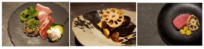 (画像左)【秋の前菜盛り合わせ】左から和牛と茸のタルト、ハモンテルエル、シャインマスカットとひこま豚のカプレーゼ。/(画像中央)【みかん猪と秋野菜の重ね焼き】薪でじっくりと火入れした秋野菜とみかん猪を重ね、奥行きのある味わいに。/(画像右)【エゾジカロースのかまど焼】癖がなく淡泊でさっぱり。噛み締めるたびに、凝縮された旨みを感じられる。