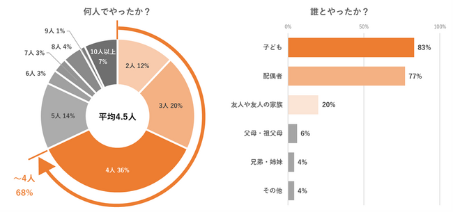 まずはアンケートの回答から見てみましょう。参加人数は4人以下が多く、参加者は「子供と配偶者」が多い結果でした。つまり家族内で実施している事が多いようです。10人以上でのパーティーや友人や友人の家族を招いてのパーティーを実施している人も一定いますが、日本においては家族で楽しむことがまだ主流のようです。また、コロナが明けたとはいえ、自宅に家族以外の人を招くことに対する抵抗感が残っているのかもしれません。