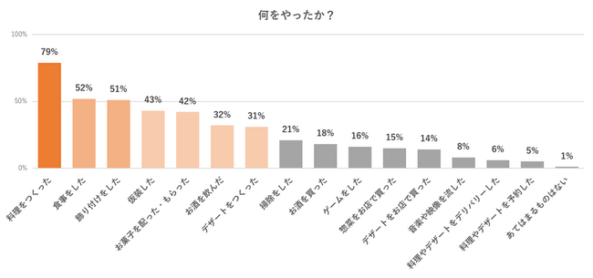 次に、やったことについては、約8割が「料理をつくった」、約3割が「デザートをつくった」と回答しており、多くの人が何らかの食事をご家庭で作られたようです。一方、お惣菜やデザートをお店で買った割合は約15%、デリバリーを利用した割合は6%と、手作りと比べると少ないようです。
