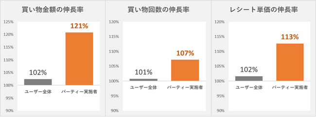 スーパーマーケットにおいて、「イエナカハロウィンを実施した週」と「その前の週」の買い物金額の伸長率を、「ユーザー全体(*)」と「実施したユーザー」で比較をしました。ユーザー全体では102%の伸長率に対し、実施者の伸長率は121%と、実施者の方が比べると多く、約20%分、普段の買い物よりも多く買い物をしていました。つまり、このような「ハレ」のイベントには少しお金を使い、メリハリのある買い物をしていたようです。
