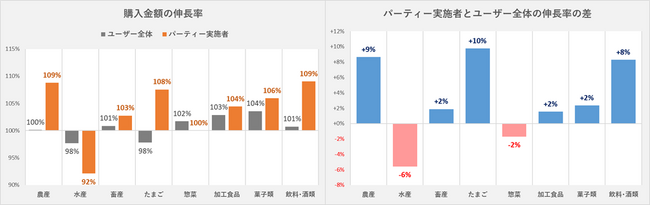 さらに、どの売場で多く買い物をしたのかを見てみました。スーパーマーケットの食品の売り場別に、実施者の購入金額の伸長率を確認したところ、水産売場以外は伸長していることが分かりました。また、ユーザー全体の伸長率と比べると、農産、たまご、飲料・酒類売り場の伸長率が特に高いことが分かりました。