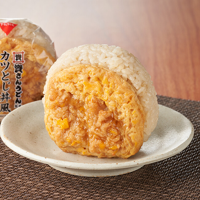 【特長】資さんうどんの人気メニュー「カツとじ丼」をおむすびにアレンジした商品です。甘めに仕上げたカツとじと、割り下が染み込んだカツとじ丼のご飯をイメージしただしご飯を合わせ、味の一体感が出るように仕立てました。