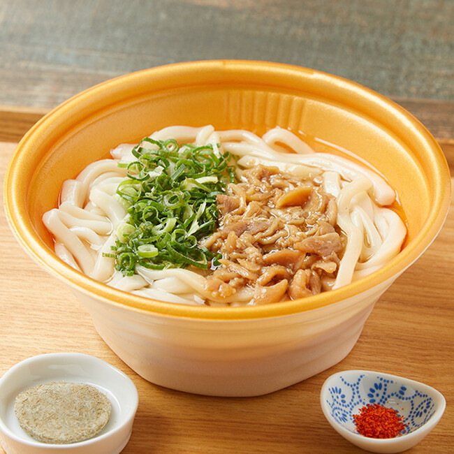 【特長】資さんうどん監修によるレンジで温める九州地方定番の「かしわうどん」です。しっかりとした弾力ある麺に、サバ節等のうま味あるだしを使用したつゆと、甘めに味付けした鶏肉と青ネギを合わせました。