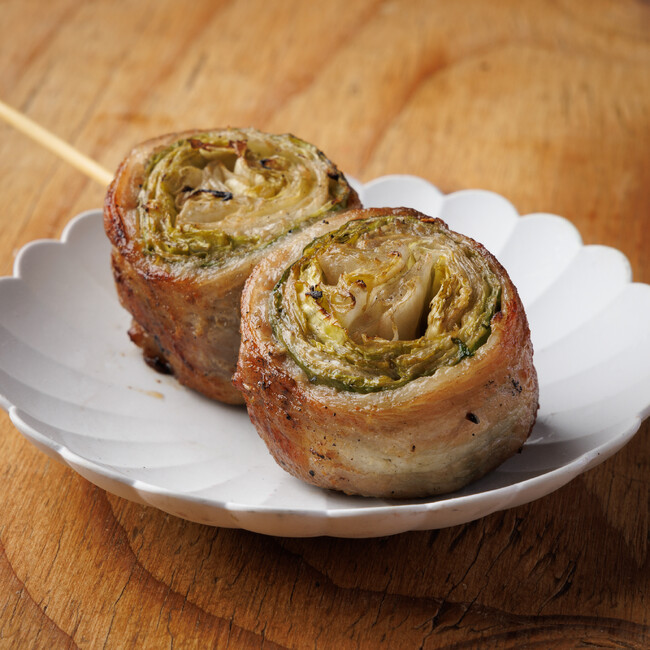 豚バラの脂身とシャキッと爽やかなレタスがバランスのいい一品。お子様から女性、男性まで人気No.1の串焼きメニューです。
