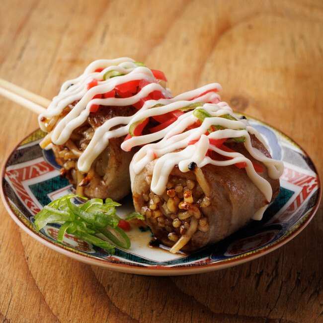 ●豚バラしそ巻き 200円 ●ニラチーズ巻き 300円 ●万能ねぎ巻き 300円 ●ピーマンチーズ巻き 250円 ●アスパラ1本巻き 250円 ●ズッキーニモッツァレラ巻き 250円 ●エリンギ巻き 200円 ●しいたけ巻き 200円 ※全て税込み価格です。